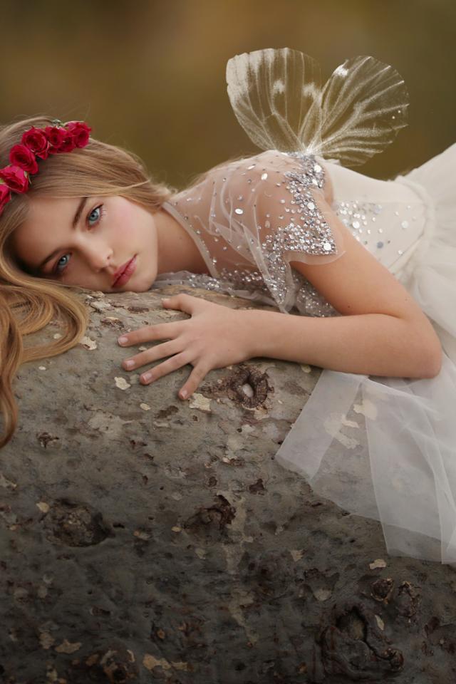 Wallpaper Beautiful little girl in a white dress lies on a stone