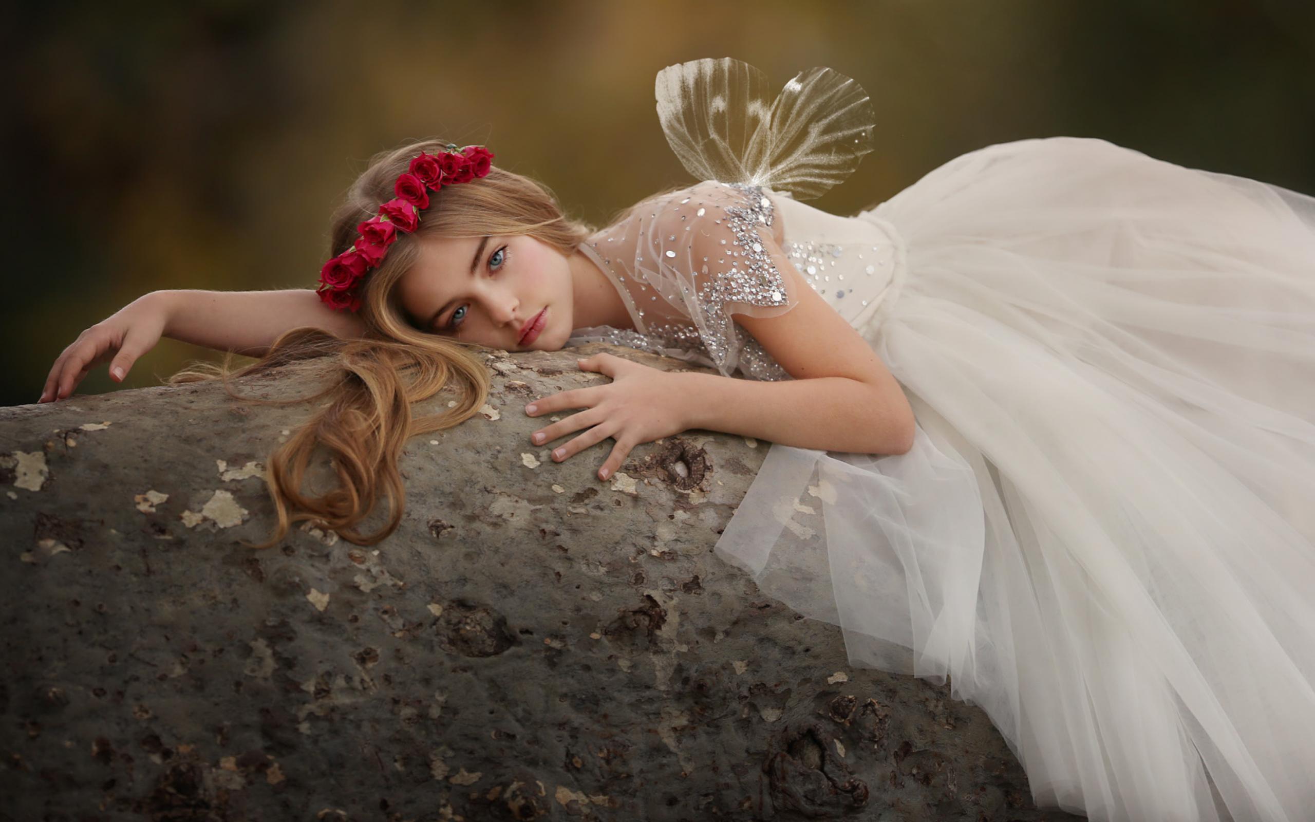 Wallpaper Beautiful little girl in a white dress lies on a stone