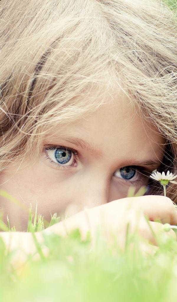 Wallpaper Little blue-eyed girl on the grass with chamomile