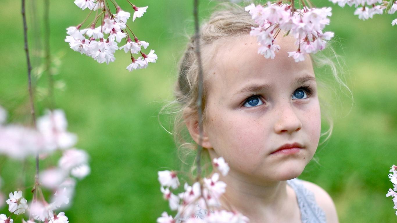 Wallpaper A little blue-eyed girl with branches of spring flowers