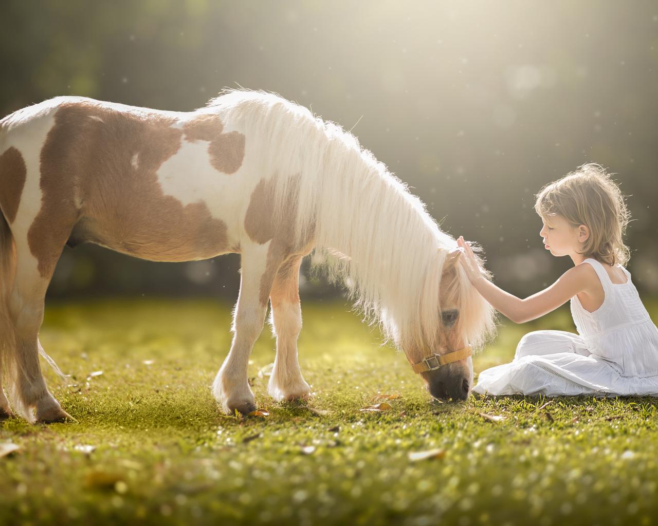 Wallpaper Little girl in a white dress with a pony