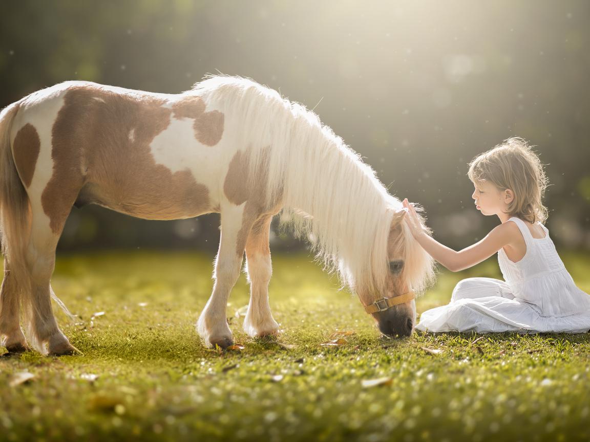 Wallpaper Little girl in a white dress with a pony