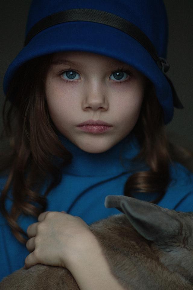 Wallpaper Little girl in a blue hat with a rabbit