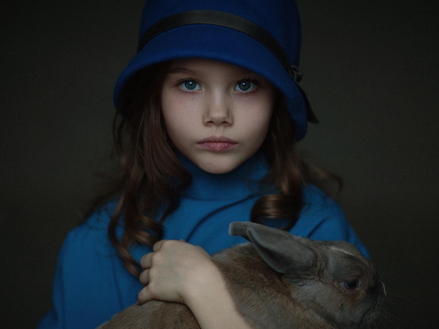 Wallpaper Little girl in a blue hat with a rabbit