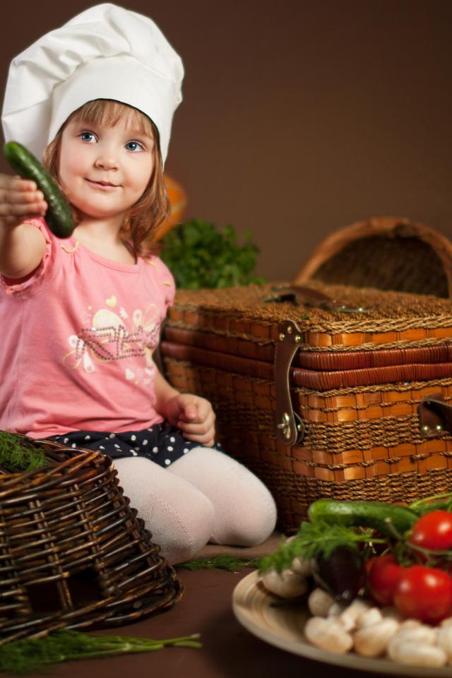 Wallpaper A little girl in a chef`s hat with a cucumber in her hands
