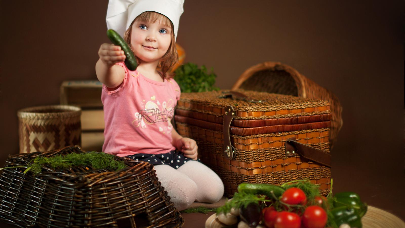 Wallpaper A little girl in a chef`s hat with a cucumber in her hands