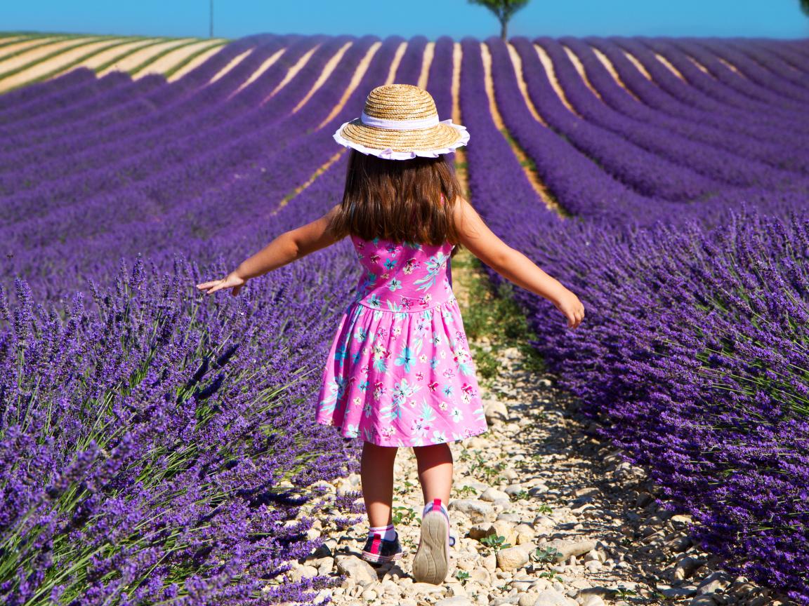 Wallpaper Little girl walking through the field with lavender