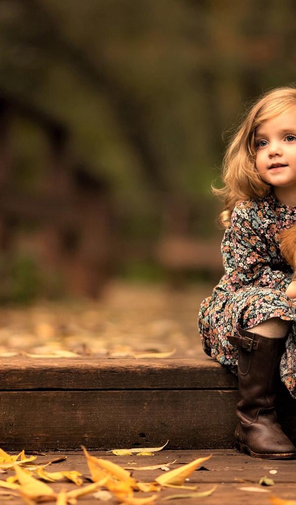Wallpaper A little girl with a golden retriever sits on a bridge