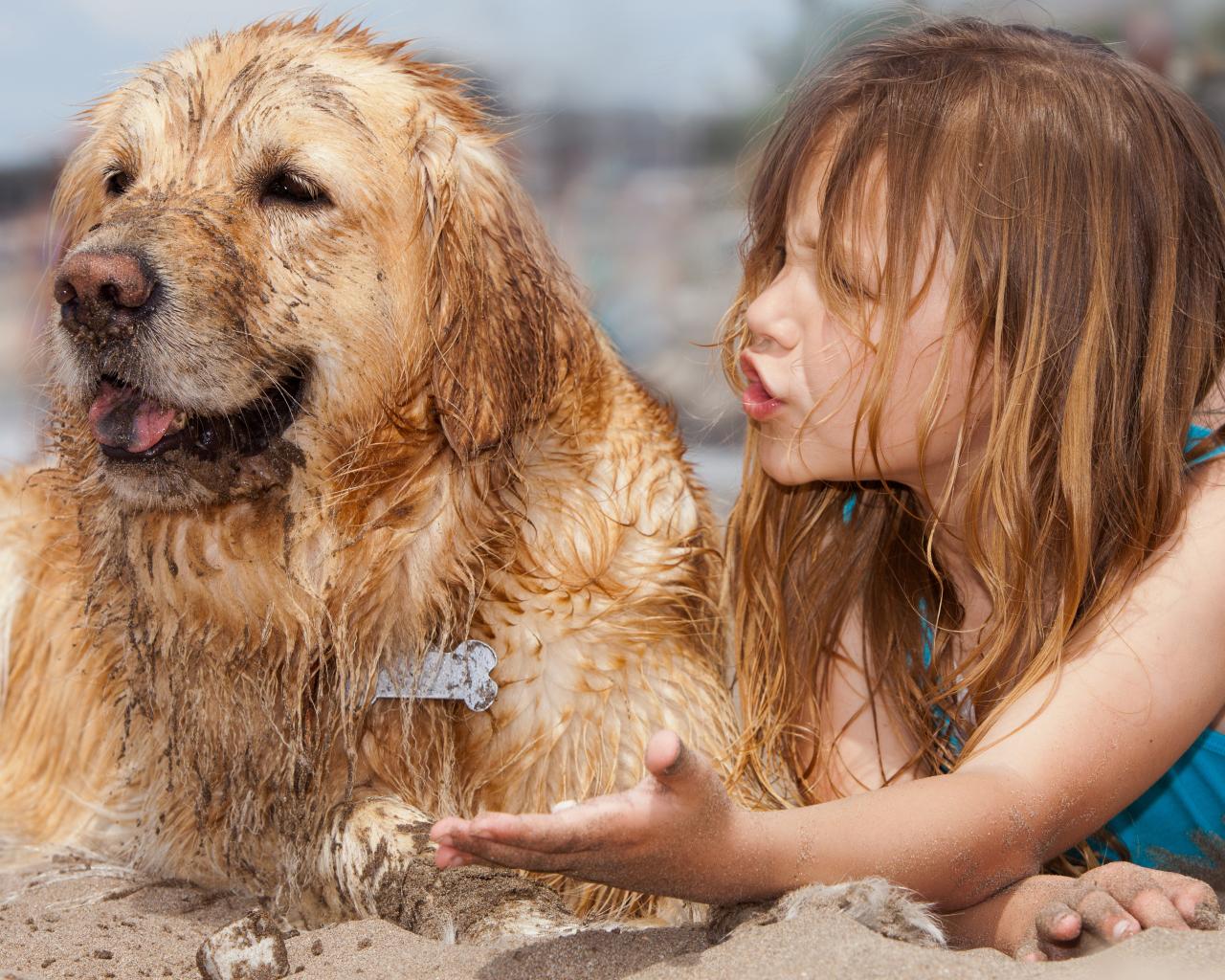 Wallpaper Little girl with a wet dog on the sand