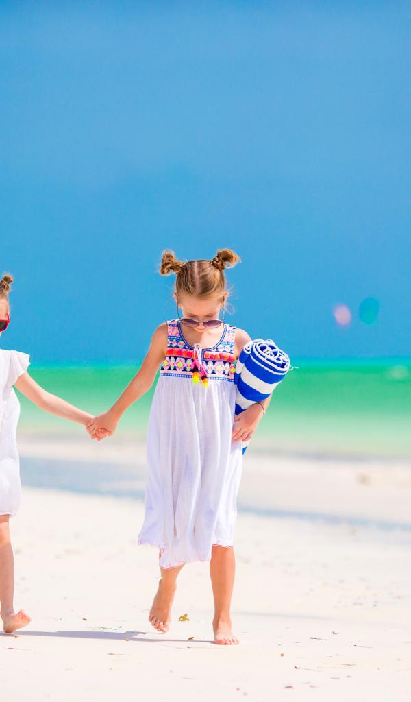Wallpaper Two little girls are walking along the sand