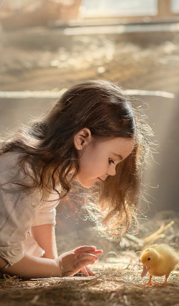 Wallpaper Little girl with ducklings in a barn