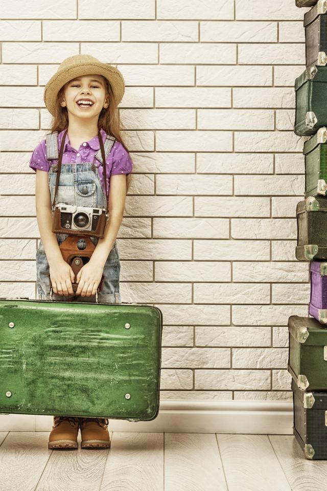 Wallpaper Little girl at the wall with big suitcases