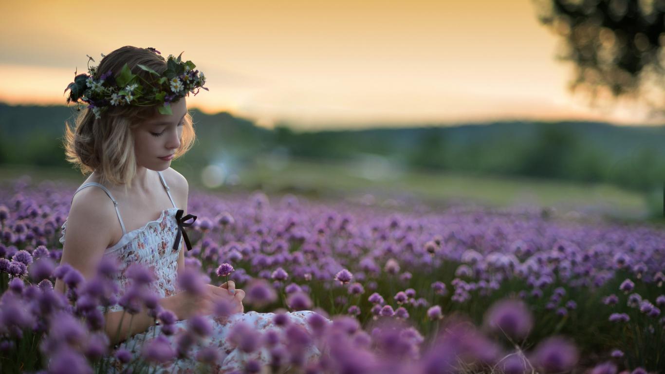 Wallpaper Gentle little girl sits on the field with lilac flowers