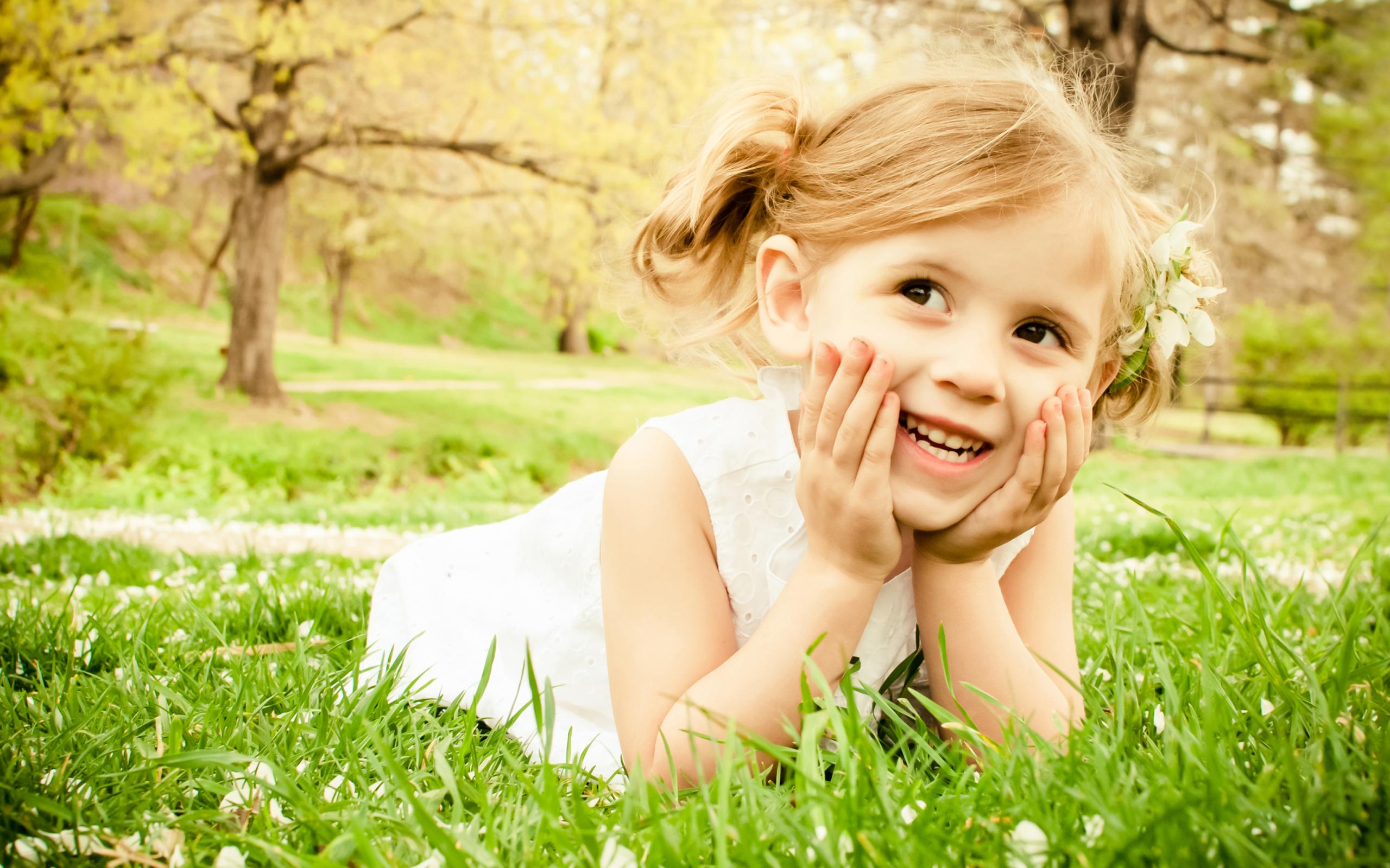 Wallpaper Smiling girl in white dress lies on green grass