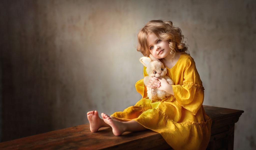 Wallpaper Beautiful little girl in yellow dress with toy