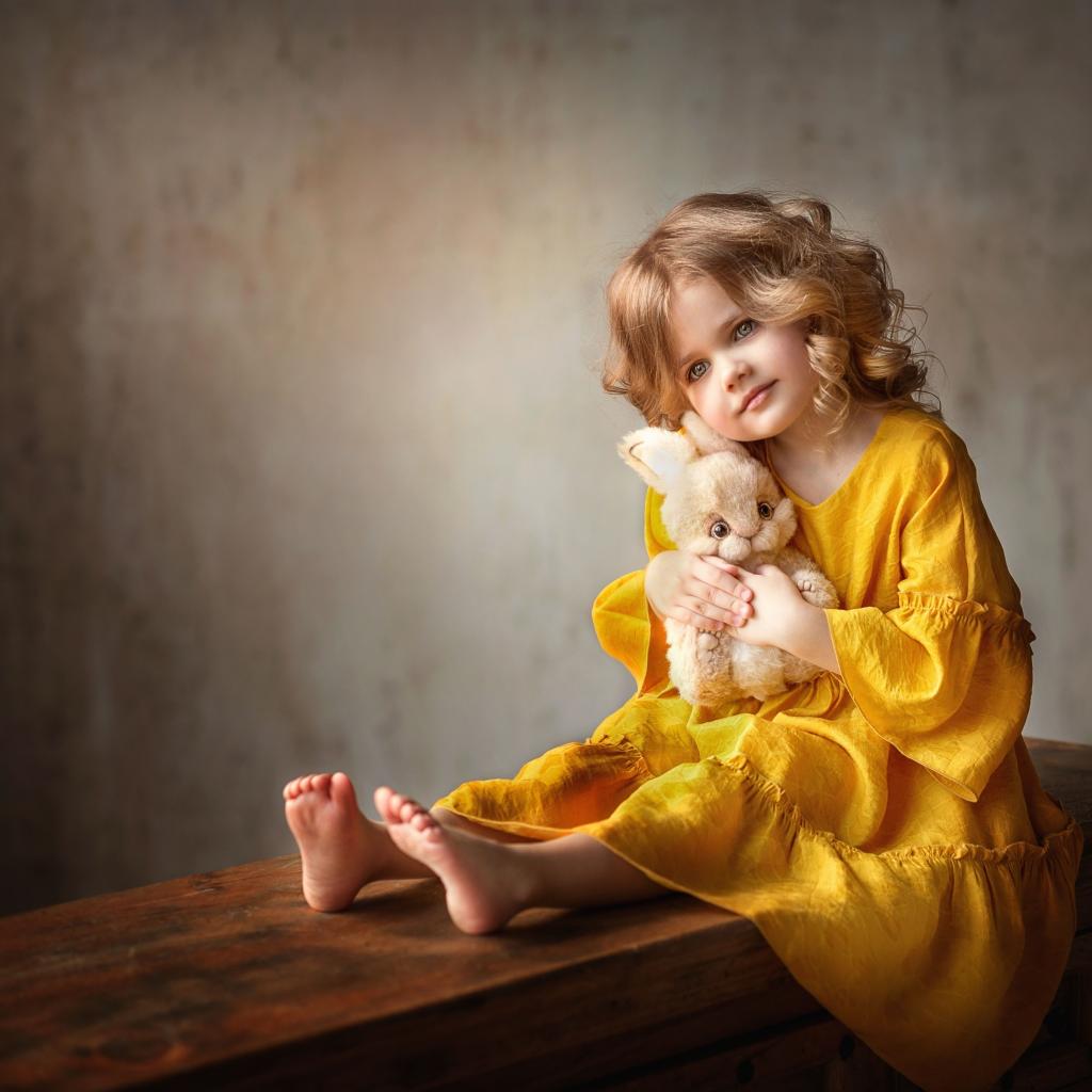 Wallpaper Beautiful little girl in yellow dress with toy