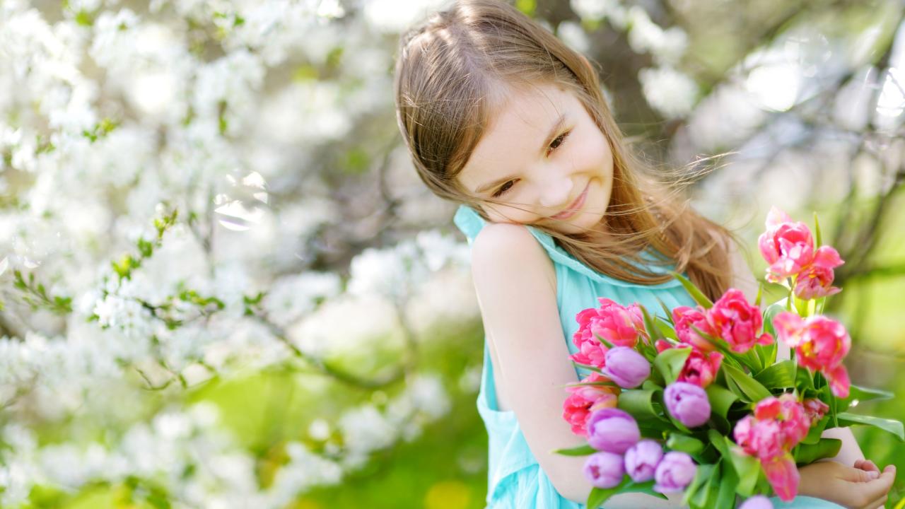 Wallpaper Beautiful little girl with a bouquet of tulips in the spring