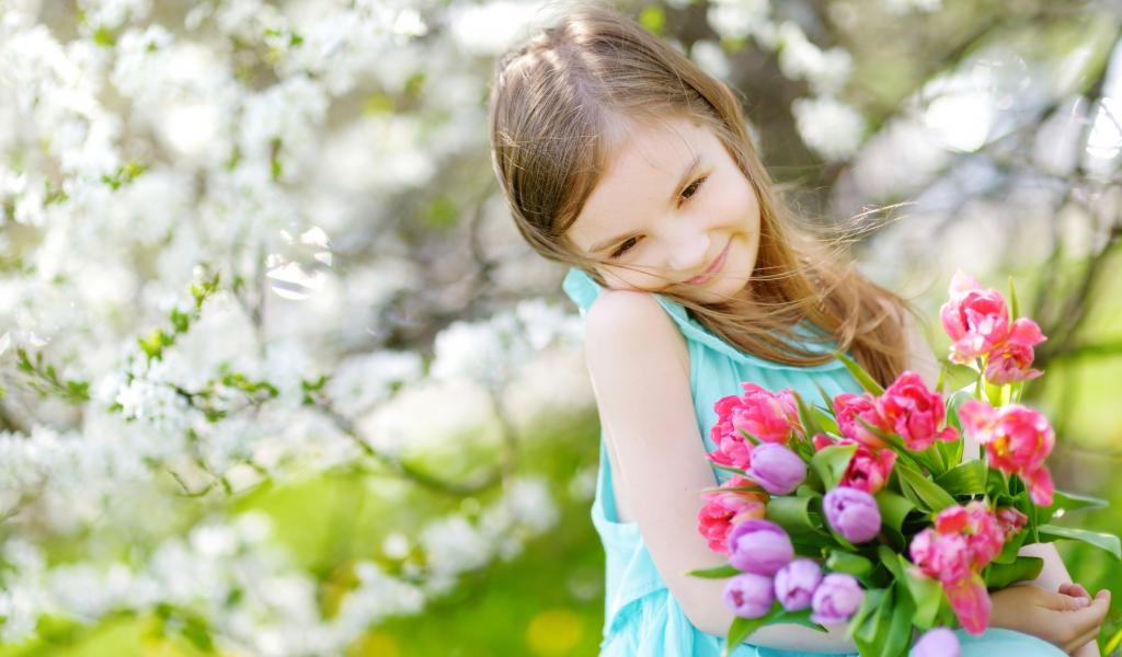 Wallpaper Beautiful little girl with a bouquet of tulips in the spring