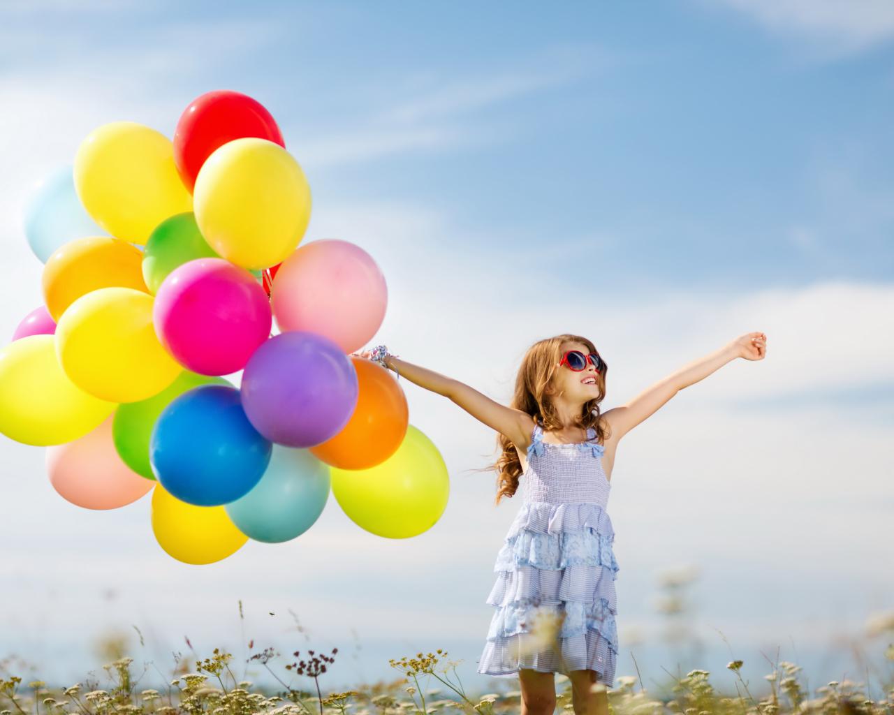 Wallpaper Little girl holding many balloons in her hand