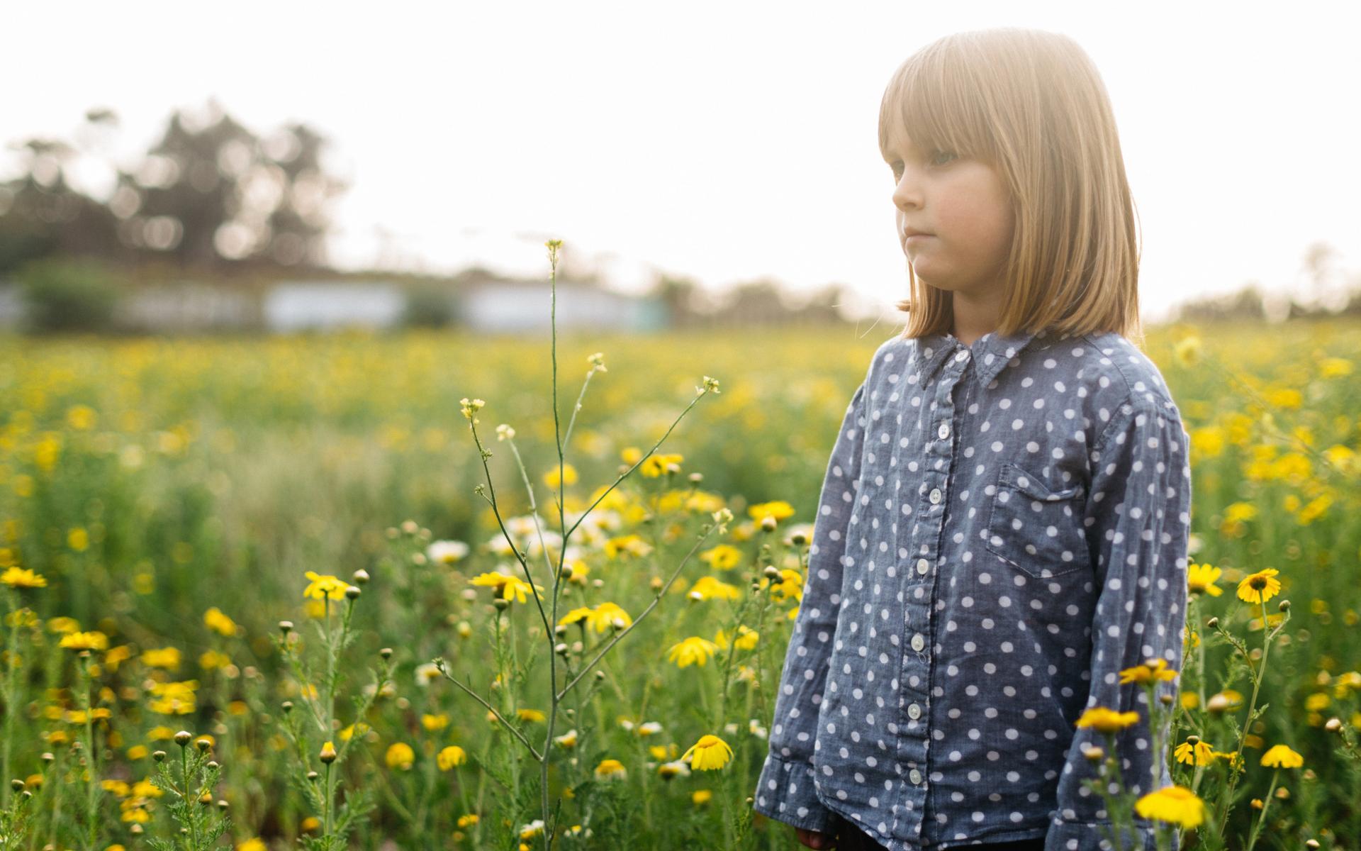 Wallpaper Little girl on the field with yellow wildflowers
