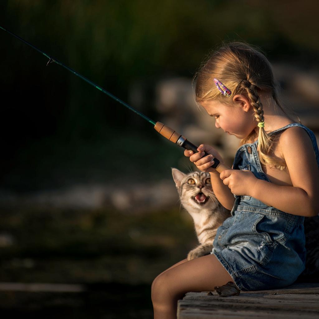 Wallpaper Little girl on a fishing trip with a cat