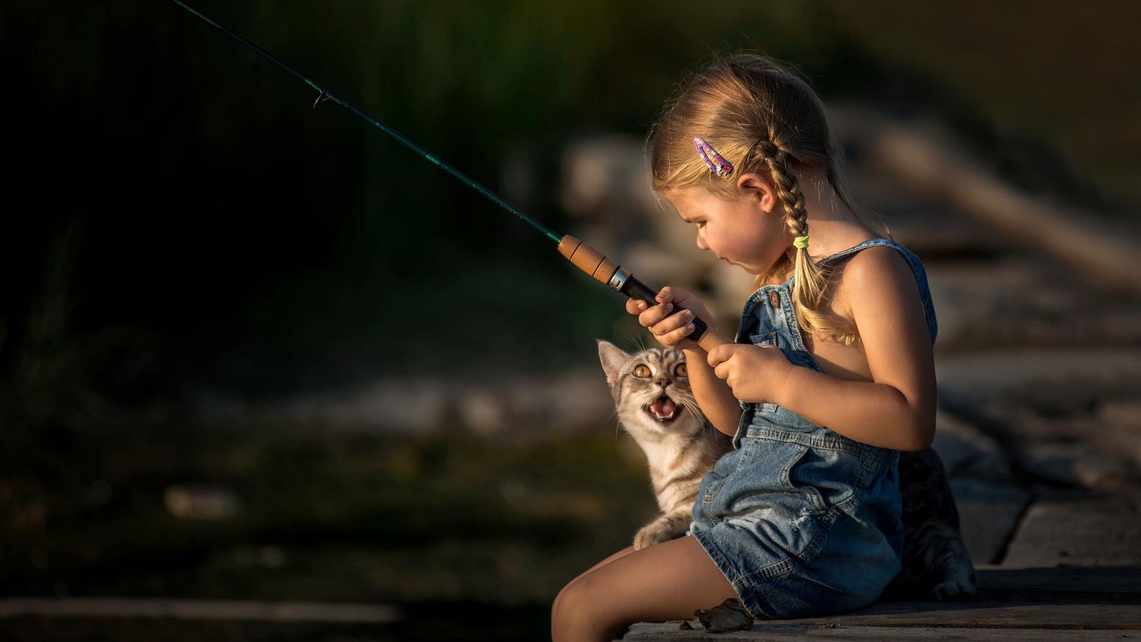 Wallpaper Little girl on a fishing trip with a cat