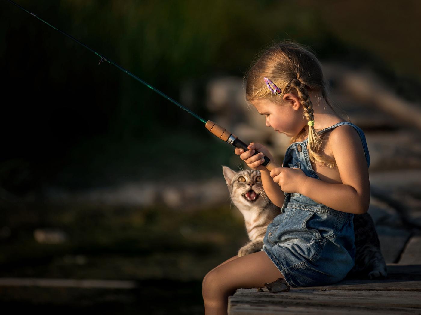 Wallpaper Little girl on a fishing trip with a cat