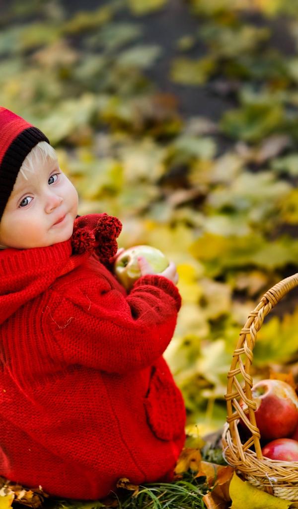 Wallpaper Little girl with a basket of apples in autumn