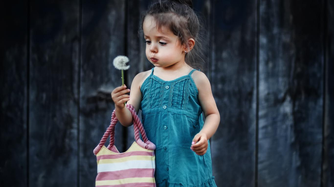 Wallpaper Little girl with a bag and a dandelion in her hand