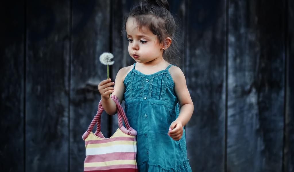 Wallpaper Little girl with a bag and a dandelion in her hand