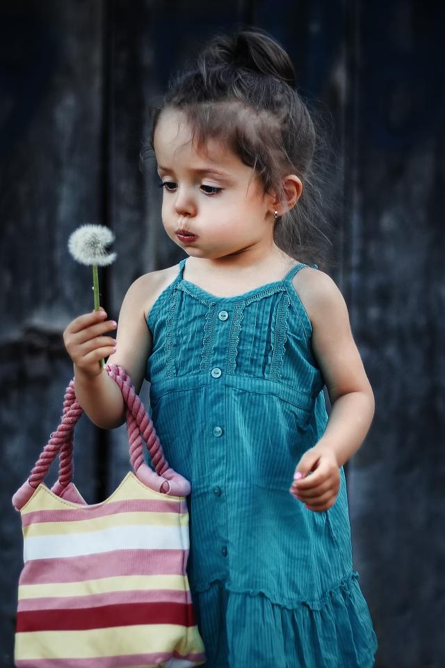Wallpaper Little girl with a bag and a dandelion in her hand