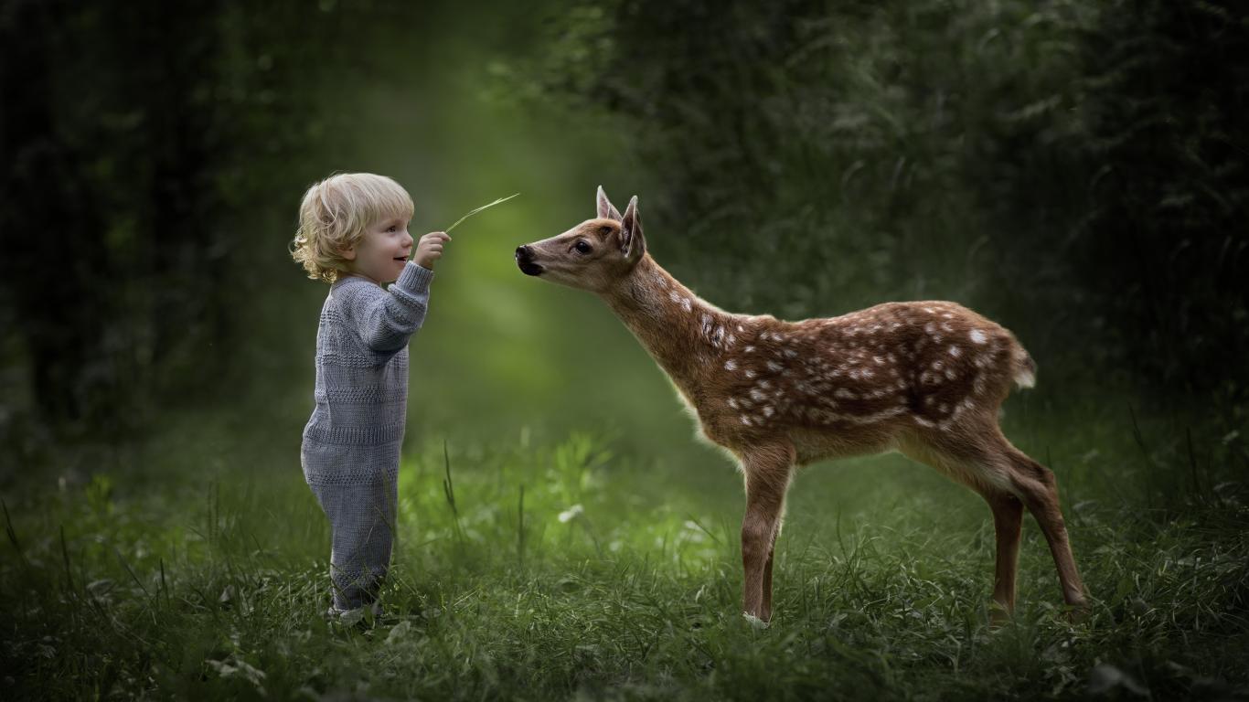 Wallpaper Little boy with a deer in the forest
