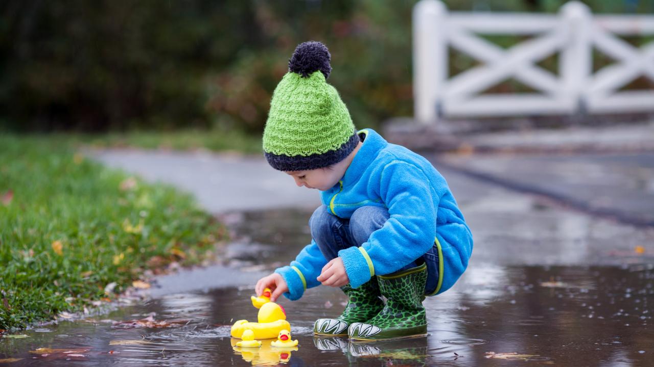 Wallpaper Little boy with rubber dots in a puddle in autumn