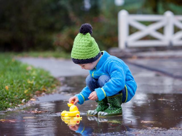 Wallpaper Little boy with rubber dots in a puddle in autumn
