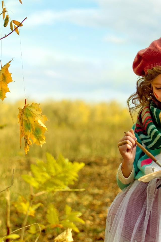 Wallpaper Little girl draws paints on the leaves in the fall