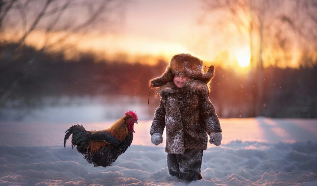 Wallpaper Little boy with a rooster in the snow in winter