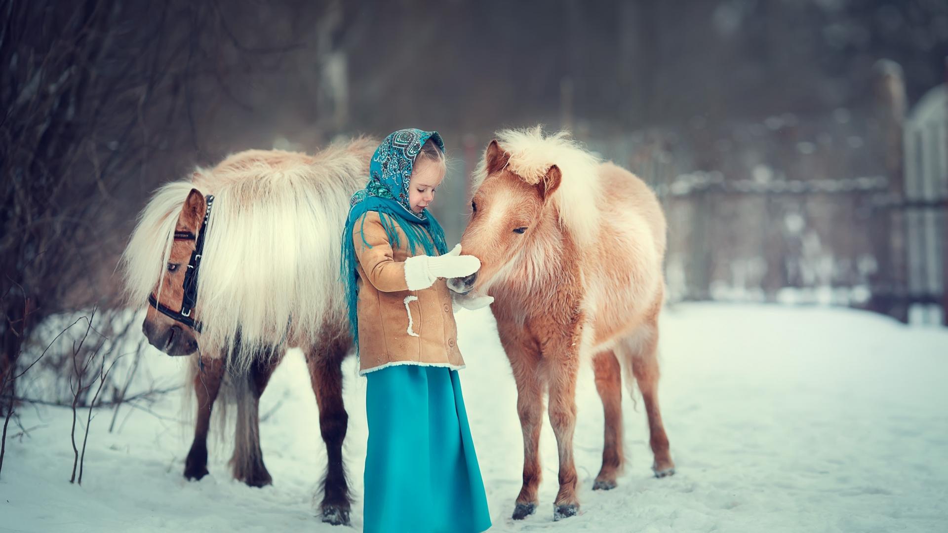 » Wallpaper Little girl with pony in winter