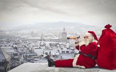 Wallpaper Little boy dressed as Santa Claus sits on a chair on a red background