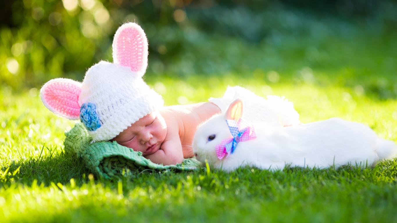 Wallpaper Little sleeping baby on green grass with white rabbit
