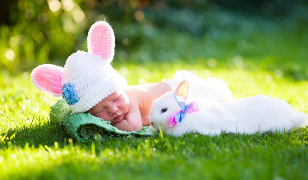 Wallpaper Little sleeping baby on green grass with white rabbit