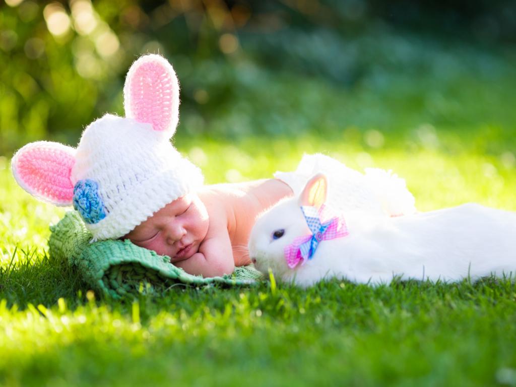 Wallpaper Little sleeping baby on green grass with white rabbit