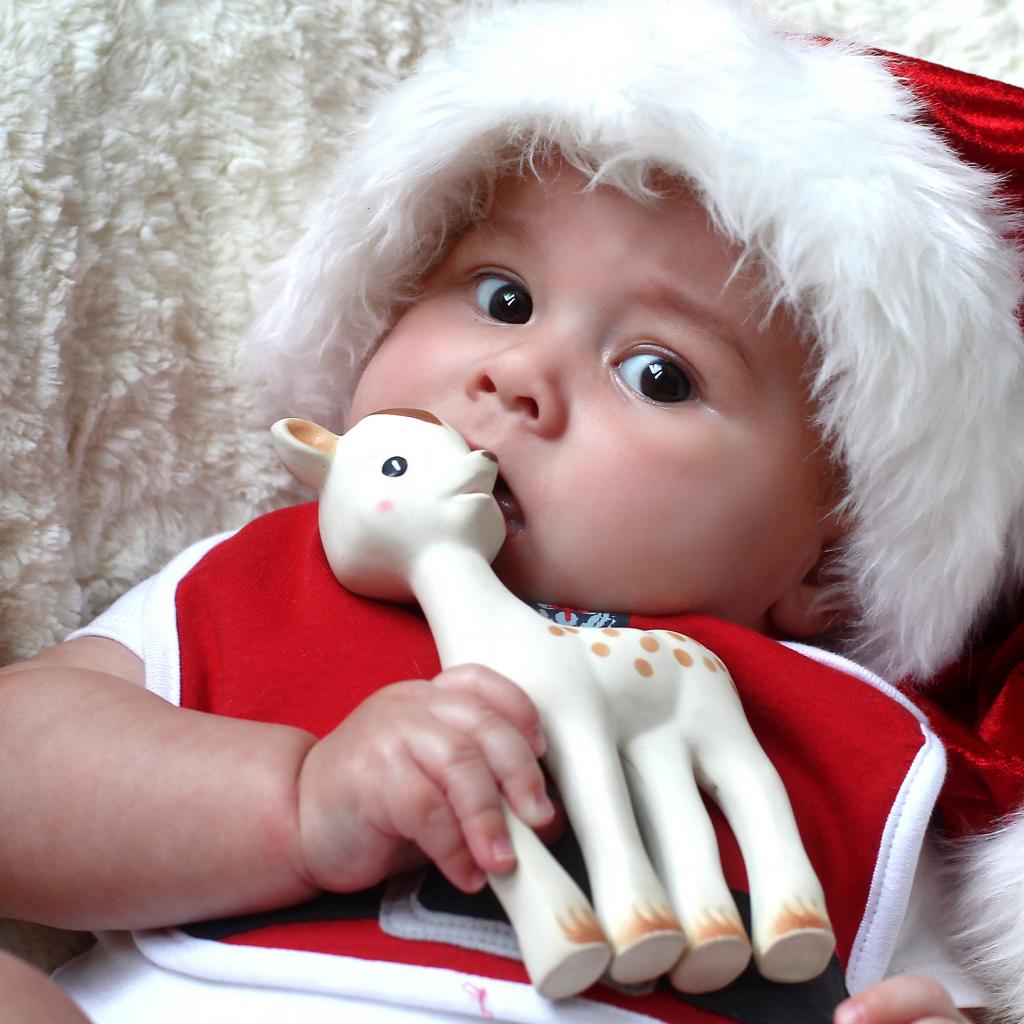 Wallpaper Little baby in Christmas hat with a toy in hand