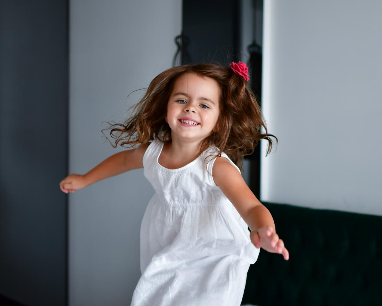 Wallpaper Cheerful girl in white dress with colorful balloons
