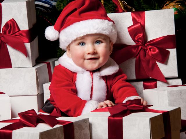 Wallpaper Little funny blue-eyed baby in a Santa suit sitting on gifts