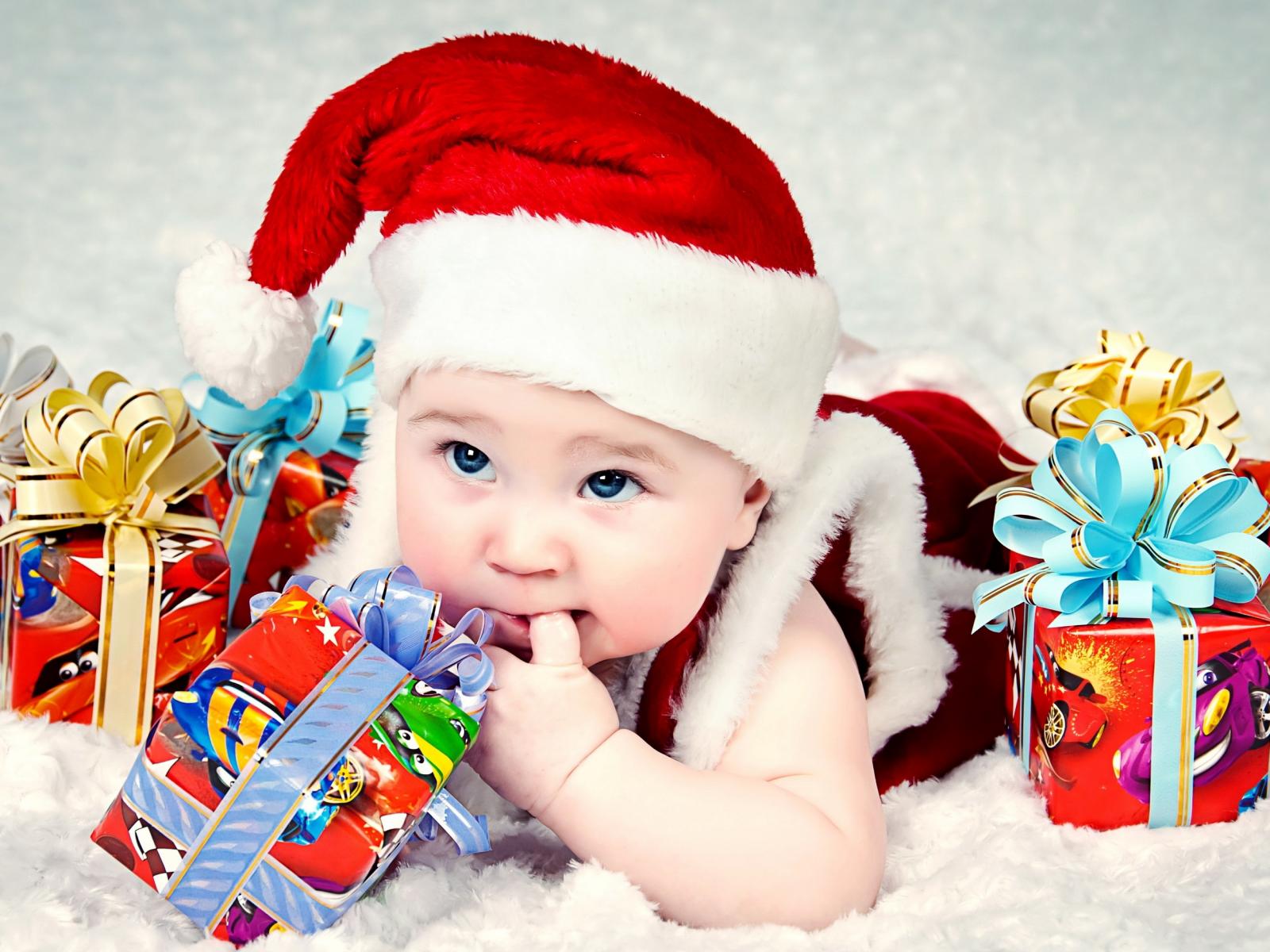 Wallpaper Little baby in a New Year`s suit with gifts