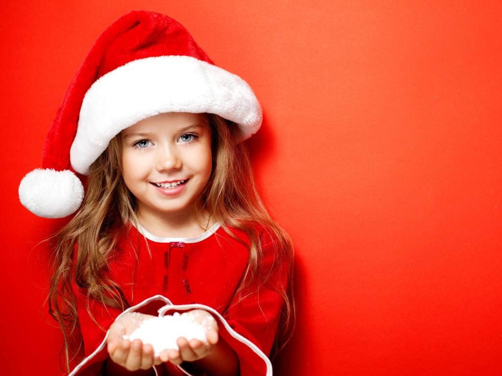 Wallpaper Little girl in christmas hat on red background