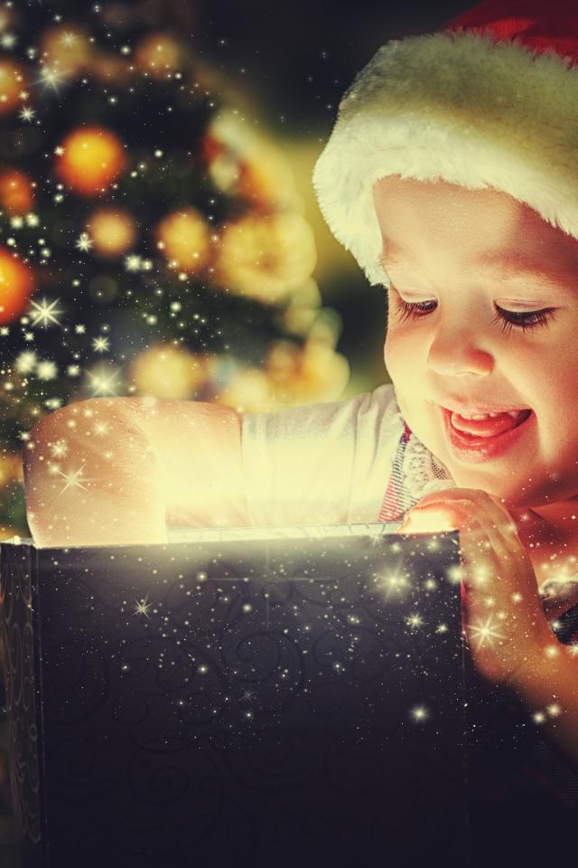 Wallpaper Little smiling girl opens a gift at the New Year tree