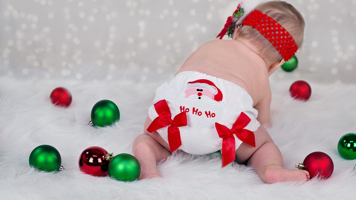 Wallpaper Little baby girl with Christmas toys on a white bedspread
