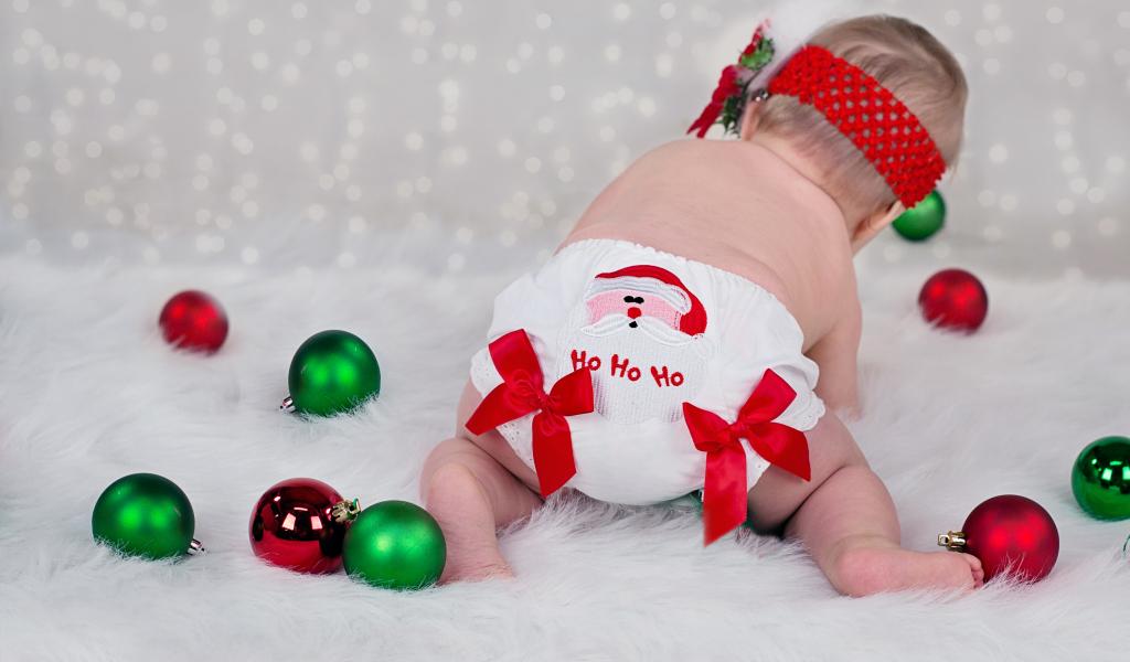 Wallpaper Little baby girl with Christmas toys on a white bedspread