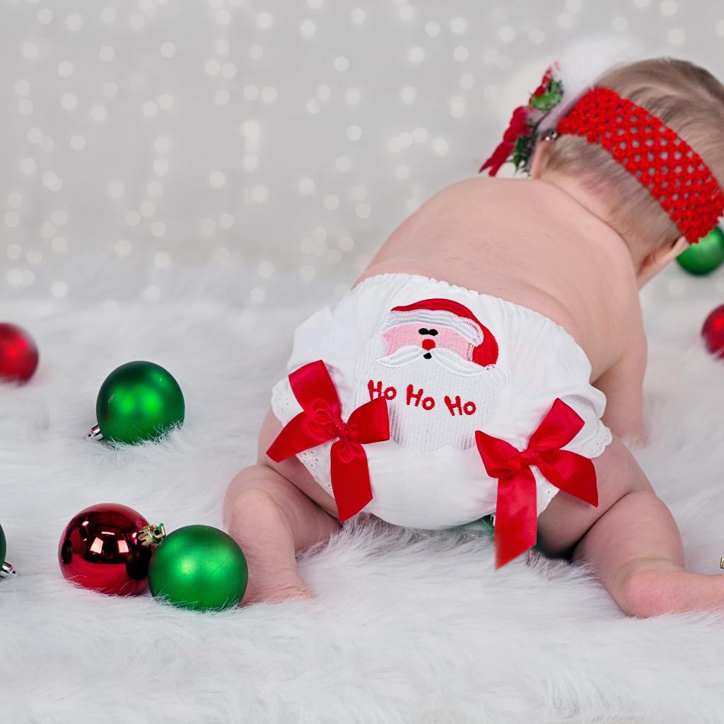 Wallpaper Little baby girl with Christmas toys on a white bedspread